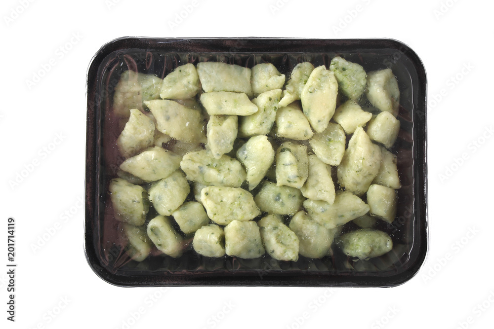 Zielone kluski . Przygotowane danie zapakowane w pudełko na białym tle