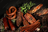 Wędzone wędliny, tradycyjny smak. Tradycyjnie wędzone wędliny w kompozycji na lnianym obrusie z ziołami
