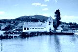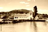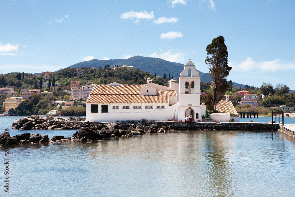 The Panagia Vlacherna Monastery of Panayia from the coast in Corfu, Greece