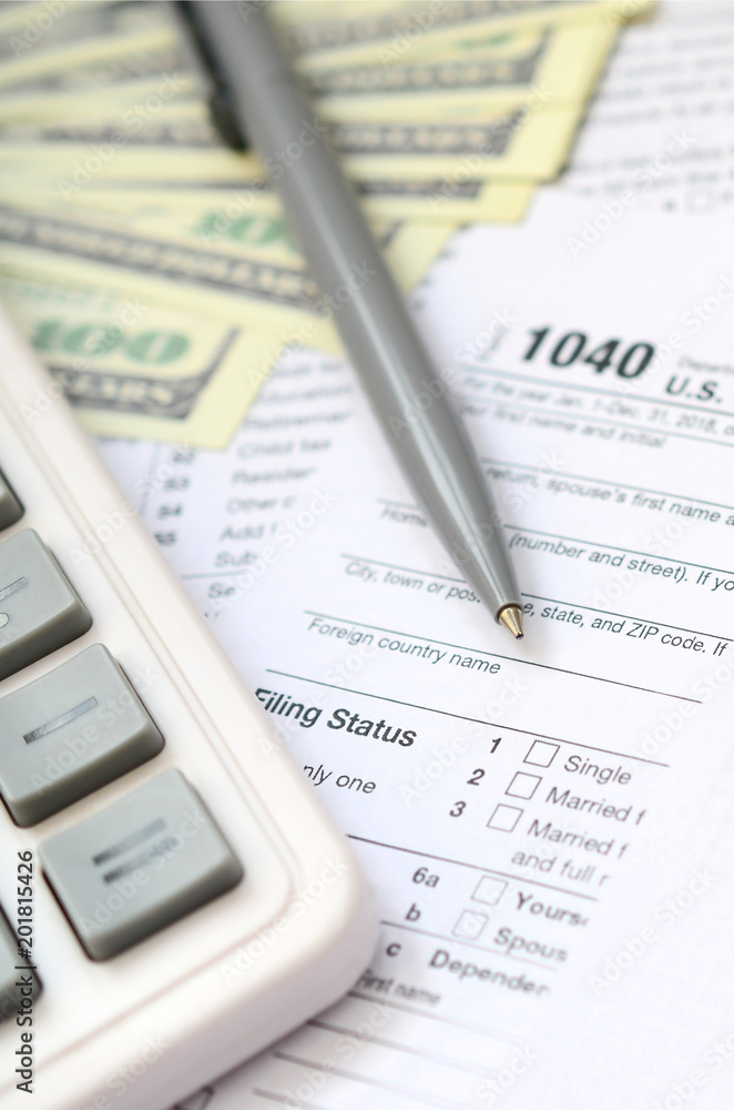 The pen, notebook, calculator, and dollar bills is lies on the tax form 1040 U.S. Individual Income Tax Return. The time to pay taxes