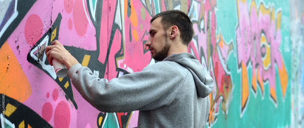 A young guy in a gray hoodie paints graffiti in pink and green colors on a wall in rainy weather
