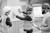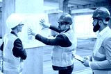 Team of successful young architects and business partners during a meeting on a construction site. Looking at architectural drawings and blueprints.