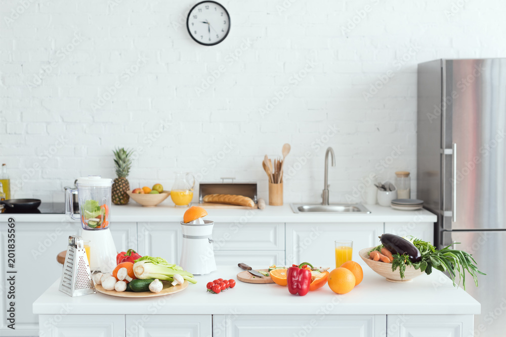 interior of white light kitchen with delicious fruits and vegetables on kitchen counter