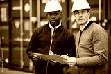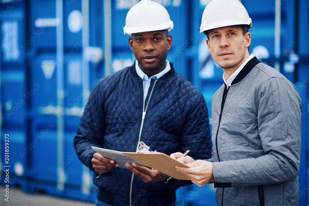 Two engineers working by freight containers on a shipping dock