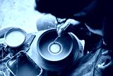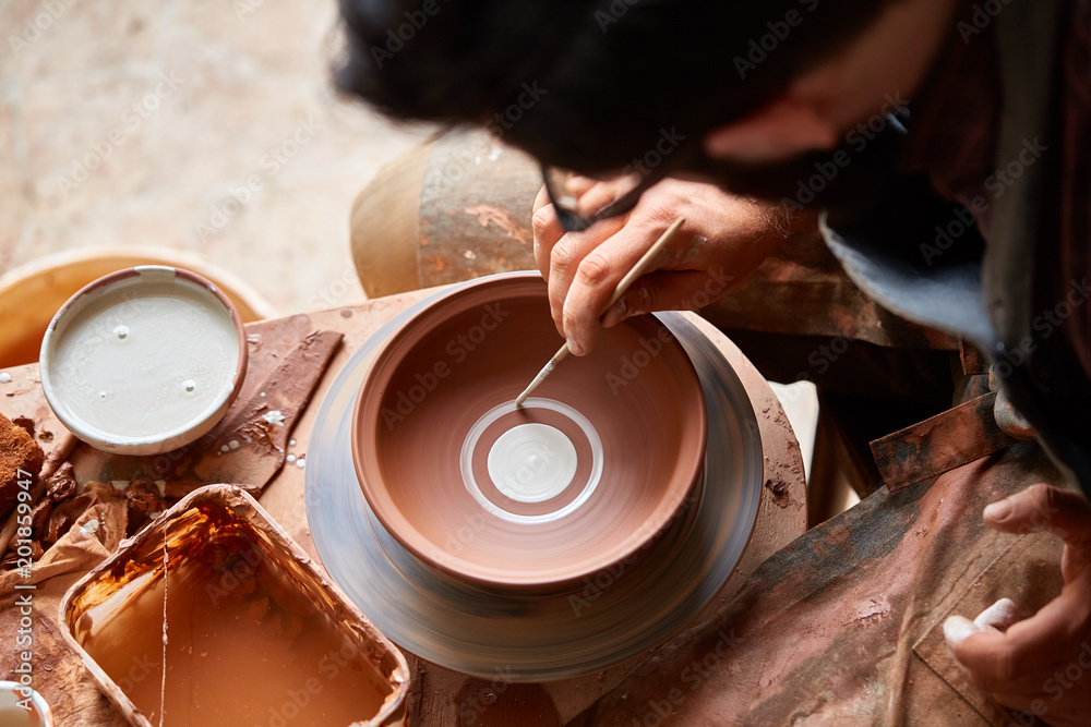 A potter paints a clay plate in a white in the workshop, top view, close-up, selective focus.