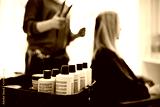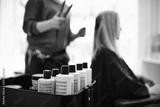 Bottles of hair styling products in a beauty salon