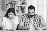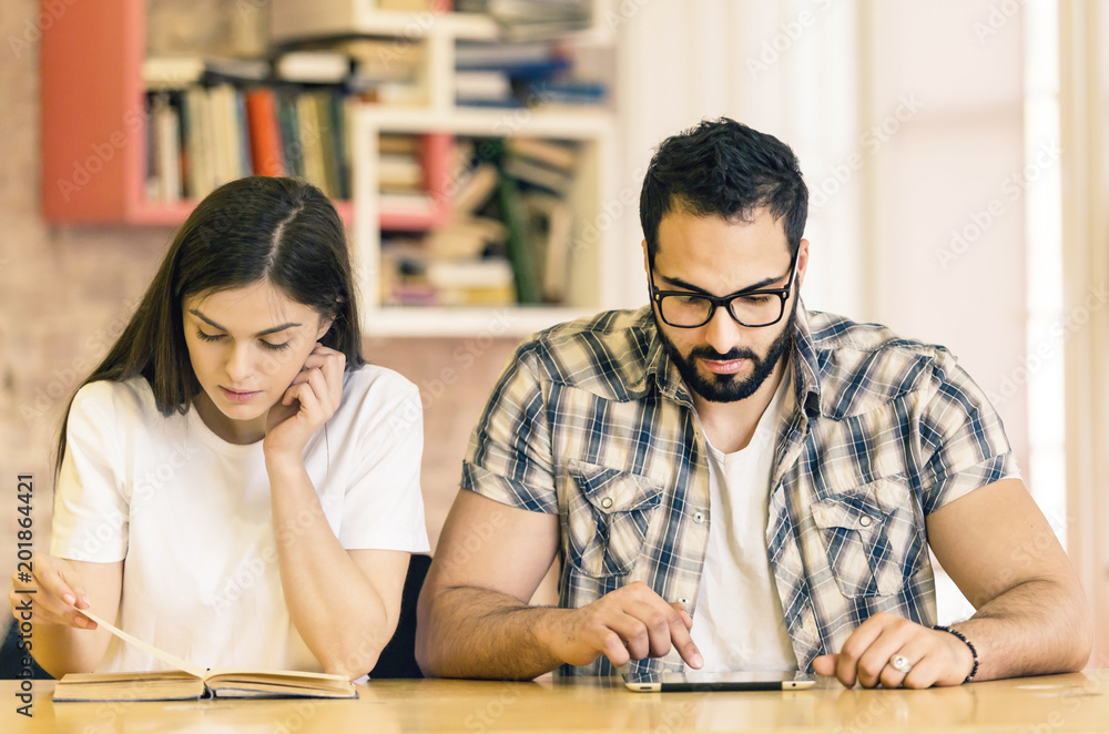 Couple of students get knowledge from book and tablet computer sitting in modern stylish room with bookshelves on background