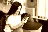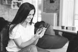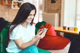 Beautiful student girl using smartphone for text messages in modern stylish coworking office