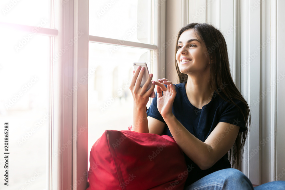 Sexy brunette girl wears blue t-shirt holds smartphone sitting on wide windowsill with big red pillow