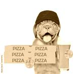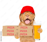 Funny pizza delivery puppy in red cap with pizza boxes and beer. isolated on white background