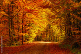 Beautiful sunny autumn landscape with fallen dry red leaves, road through the forest and yellow trees