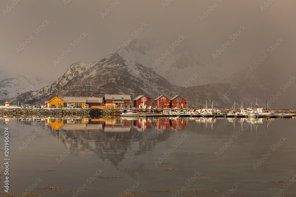 Beautiful landscape with clouds, fog, water, reflectaion in background at Lofoten Island, Norway
