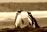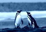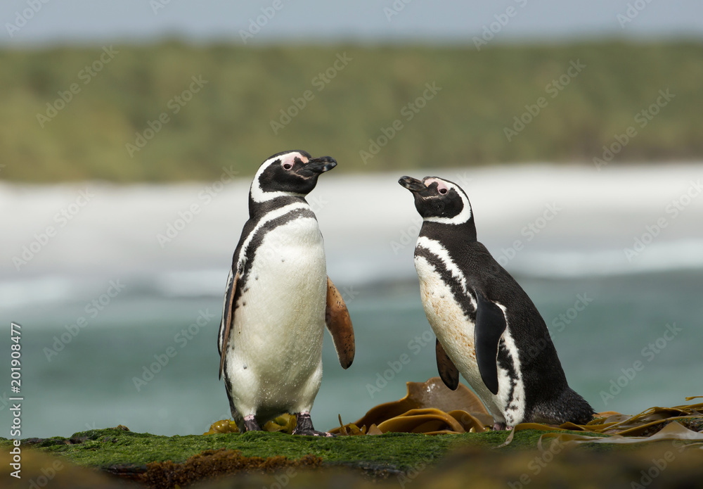 Two Magellanic penguins standing on a shore of the ocean