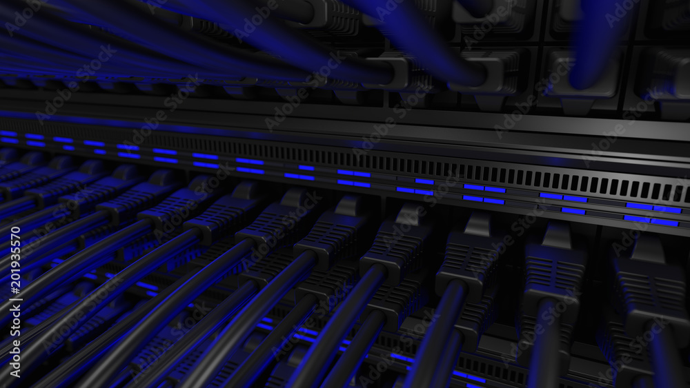 Close-up view of modern internet network switch with plugged ethernet cables. Blinking blue lights on internet server.