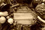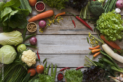 Fresh farmers market fruit and vegetable from above with copy space