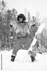 Vintage photo of young man snowboarder in the mountains. Retro style. 1980 concept.