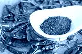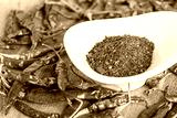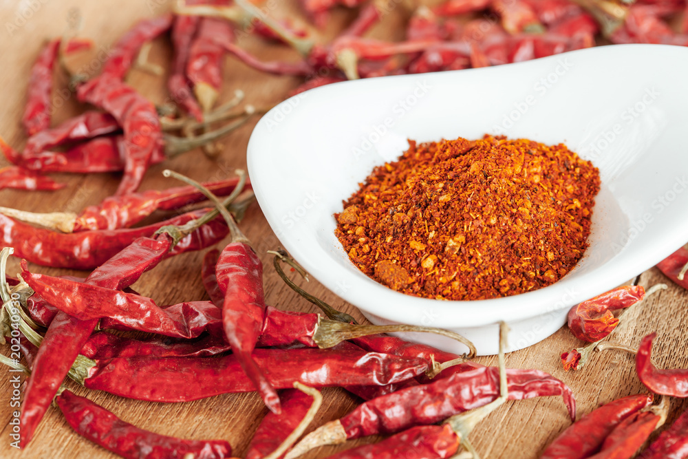 Cayenne pepper in white dish and dried chilli on wood table.
