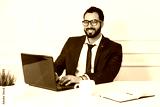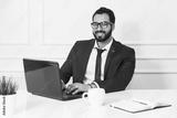 Bearded smiling businessman wears eyeglasses dressed in blue suit work with laptop in white office interior, working success concept