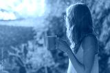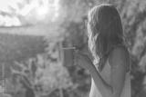 Cute girl enjoying morning coffee on the porch.