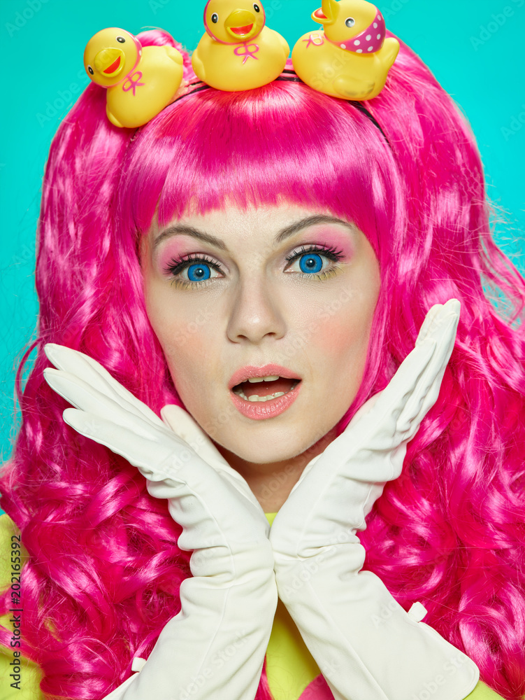 Girl doll with pink hair with different emotions. Anime style.