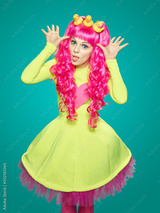 Girl doll with pink hair with different emotions. Anime style.