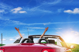 Young woman in a car with a convertible on the road to the nature on a sunny day.