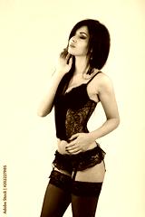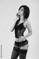 hot sensual young woman in black lingerie, corset and stockings with sexy body posing in studio on white background
