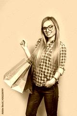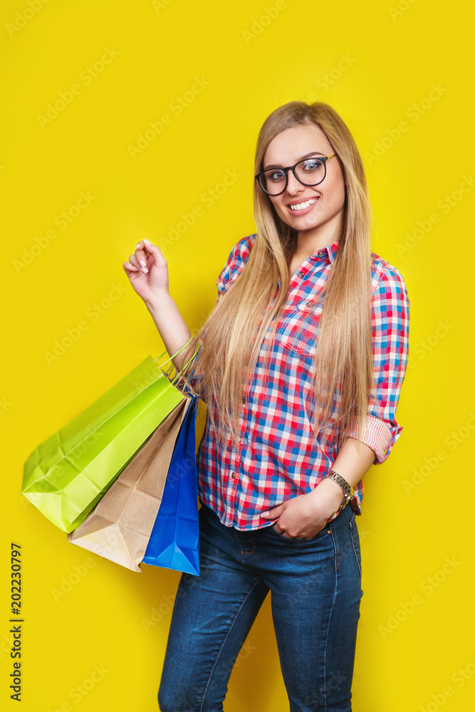 Portrait of a cheerful girl in glasses holding shopping bags and looking at camera isolated over yellow background