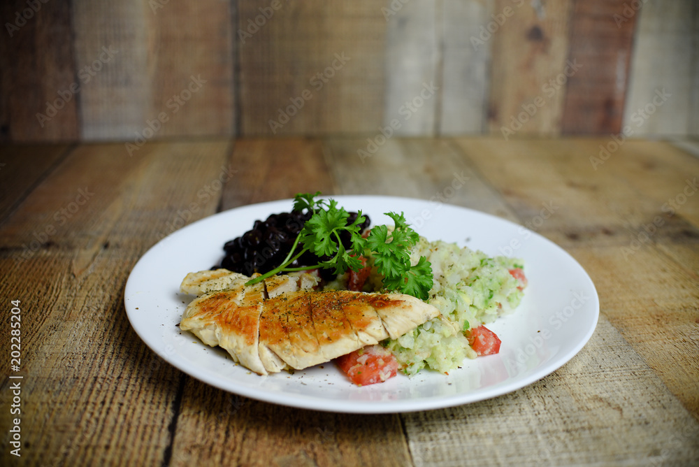 Healthy meal with chicken, cauliflower rice black beans, avocado with tomatoes and herbs.