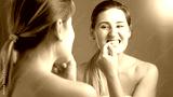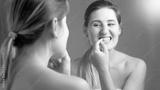 Portrait of young brunette woman trying to take out food stuck in teeth