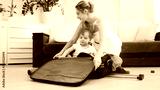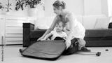Beautiful young mother and toddler boy packing suitcase for holidays