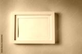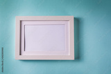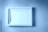 Mockup. Minimalism style. White empty picture frame against; blue color paper background; flat lay; copy space.