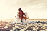 Young woman and man sitting and hugging on summer beach blanket on sandy beach on a summer time.