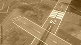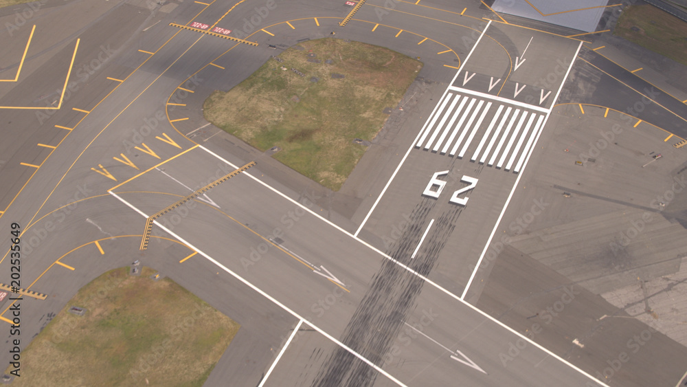 AERIAL: Pavement surface and flight markings on empty runway field on airport