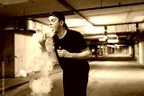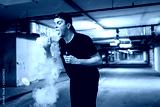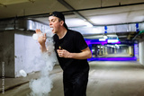 Man in cap smoke an electronic cigarette and releases clouds of vapor performing various kind of vaping tricks