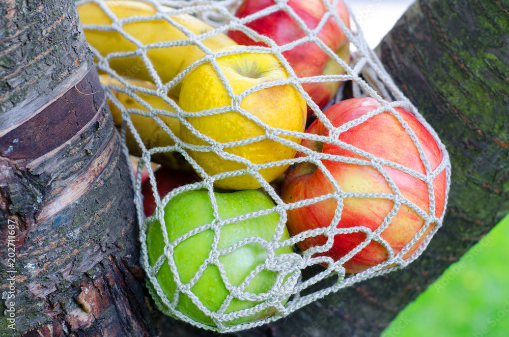 Trendy string bag with fruits. Shopping bag.