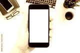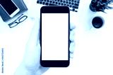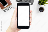 Hand holding smartphone with white blank screen over white office desk table with supplies.