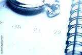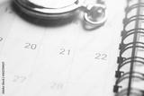 close up monthly planner with classic watch, planning for business meeting or travel planning concept