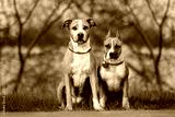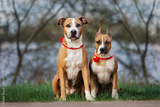 two adorable dogs sitting together outdoors