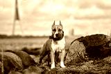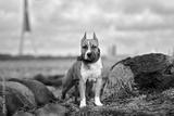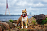 american staffordshire terrier puppy posing by the river