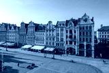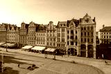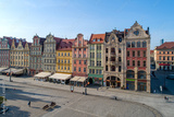 Poland, Wroclaw. Market Square (Rynek) with old historic tenements and outdoor restaurants. Aerial view. Early morning