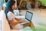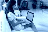 Female hands on keyboard with opened web page in browser at screen. Cropped image of woman surfing the internet her laptop.