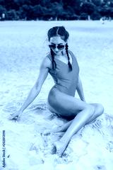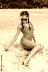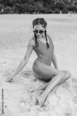 Female model with slender body wearing swimsuit sitting alone on sandy beach.