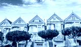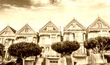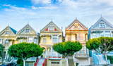 Late afternoon sun light up a row of colorful Victorian houses known as Painted Ladies across from Alamo Square. The historic houses were built between 1892 and 1896.