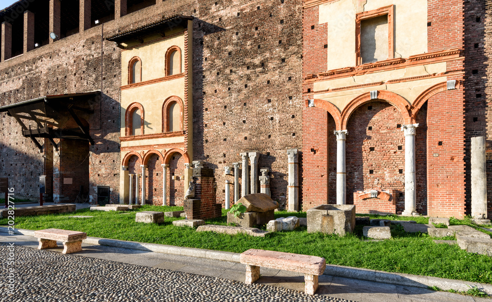 Inside medieval Sforza Castle in Milan, Italy