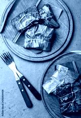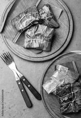 COLOMBIAN, CENTRAL AMERICAN FOOD. Tamales wrapped in banana palm tree leaves on wooden plates, gray stone background