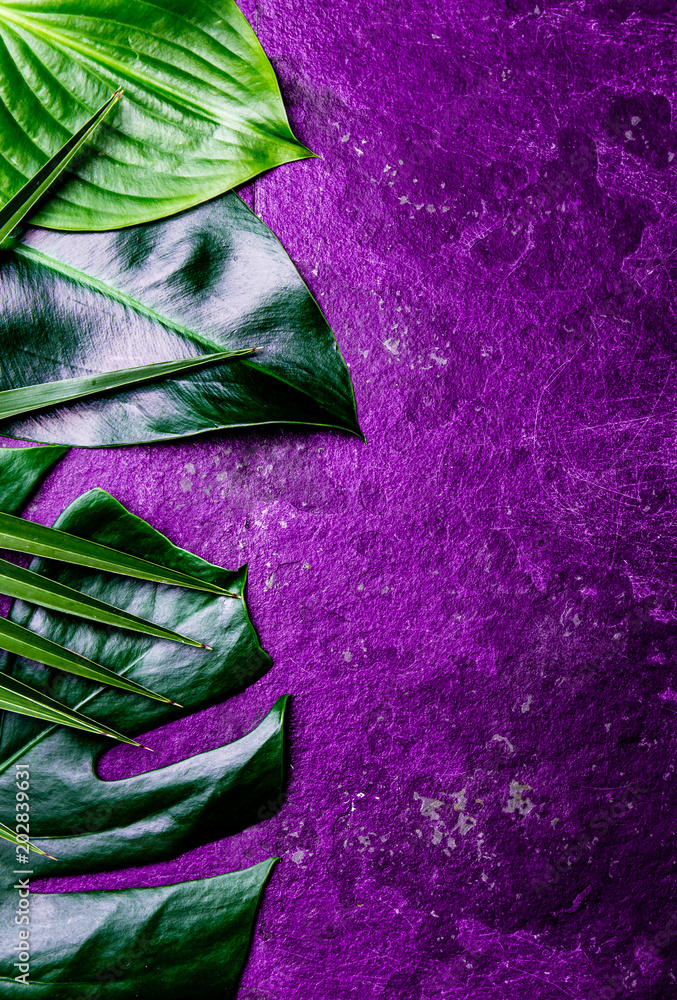 Creative tropical leaves background. Trandy tropical leaves on ultra violet slate background - color of the year 2018. Top view, copy space