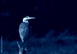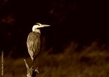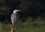 A grey heron standing tall on a tree which is submerged in the backwaters of bhadra