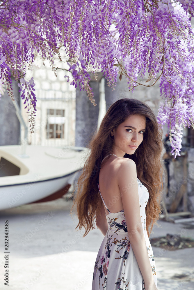 Beautiful young woman portrait over wisteria blossom. Attractive brunette girl with long healthy hair in white dress smiling at camera.
