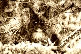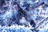 A very nice wild blue maine coon cat sitting on the pine tree in the winter snowy forest.